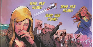 You may think that somebody at Marvel adjusted the book to serve notice to Donald Trump's racist assery but I doubt it. The thing is. Racists that don't think they're racists are always telling U.S. citizens to go back to their own countries. That includes fair-skinned Irish Catholics of the nineteenth century. Racists always believe they're smarter than everybody else and can sense when somebody's not from around here. They're not. They can't. Thompson just follows the dots of unfortunate history.