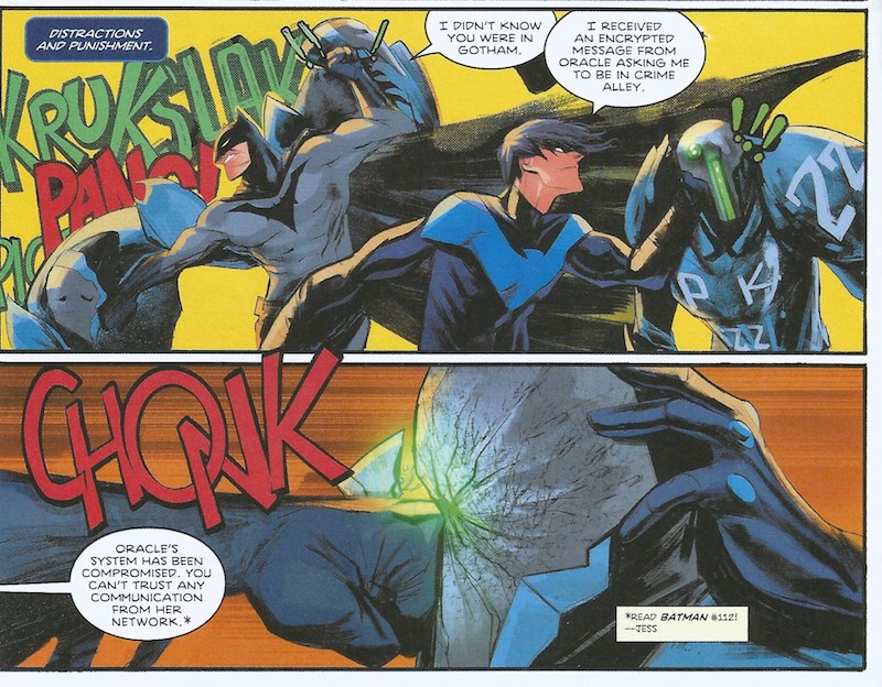 Batgirl makes a peppier appearance in Nightwing, and artist Bruno Redondo alone can take this bow. No bones to scribe Tom Taylor, but compared to the previous issues, Taylor provides a simple plot to let Redondo do his stuff. Double splash pages and after image animation comprise that stuff. Impossible to capture fully with a simple scanner but you'll get the picture from this example.