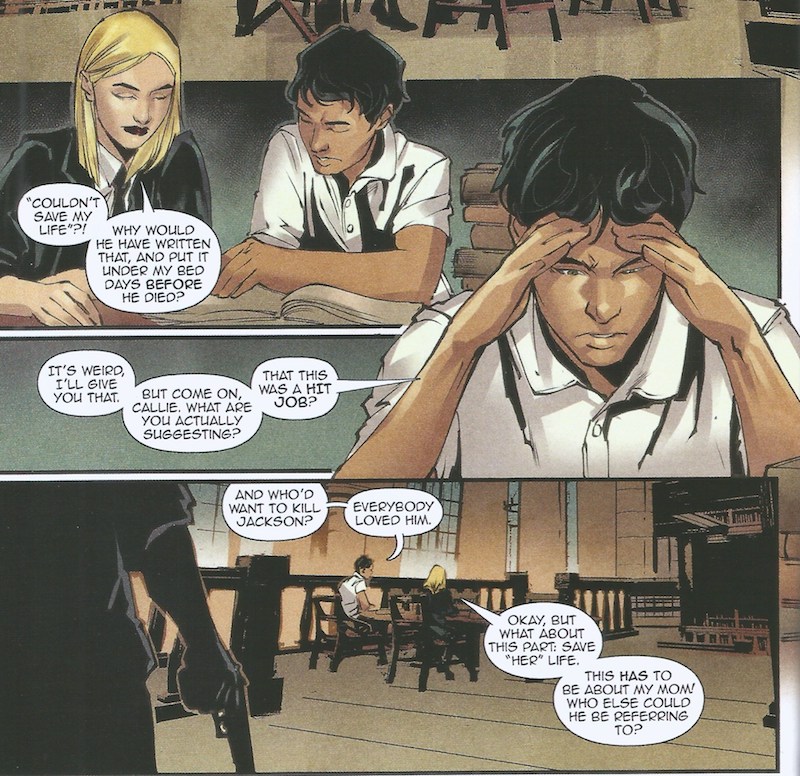 Reading the pages, she uncovers some information about Jackson. The revelation makes her consider recruiting a collaborator. Calista meets up with her friend Kaz.